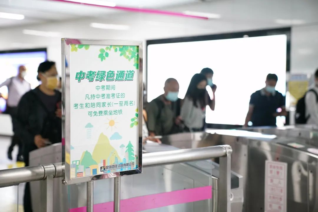 中考期间,昆明地铁全线网所有车站设置“中考绿色通道”,推行“三优一免”服务:为考生提供免费绿色通行服务,考生及2名陪同家属在考试当天可凭2023年中考准考证到客服中心领取“免费进站票”免费乘坐昆明地铁。并享受优先安检、优先进出站、优先处理乘客事务服务。