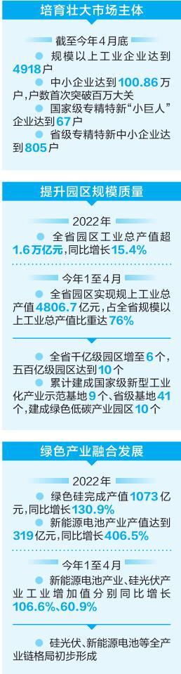2022年,我省工业总量跃上7000亿台阶;工业投资创历史最高增速,位居全国第二;绿色硅成长为新的千亿级产业;新能源电池实现从无到有、迅速壮大……
