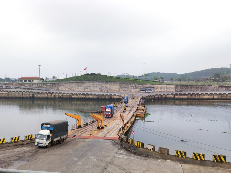 跨境货运车辆通过连通中越两国的北仑河互市浮桥(4月12日摄)。新华社记者 朱丽莉 摄