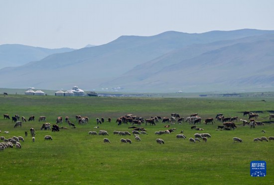 夏日,内蒙古阿鲁科尔沁草原绿意盎然,牛羊在草原上觅食,景色如画。