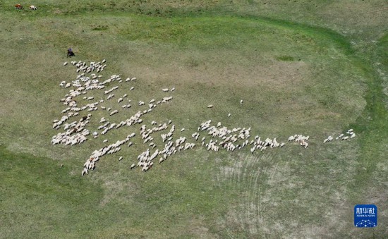 6月15日,羊群在草原上觅食(无人机照片)。