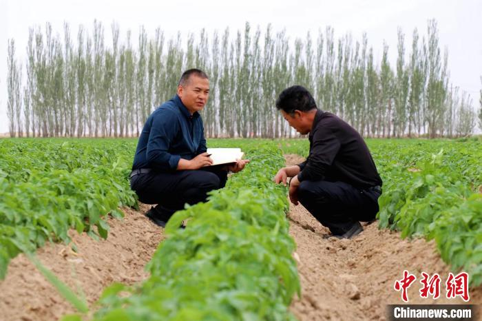 图为甘肃民勤县南湖镇麻莲井村的马铃薯繁育基地,工作人员正在查看马铃薯长势情况。吴苗/摄