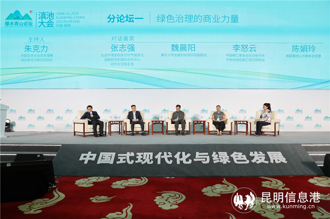 在三场分论坛上,生态环境部国家应对气候变化战略研究和国际合作中心对外交流部主任张志强、清华大学金融科技研究院副院长魏晨阳、中国碳汇基金会创会秘书长李怒云、伽蓝集团公共事务总经理陈娟玲,就“绿色治理的商业力量”主题进行了讨论。