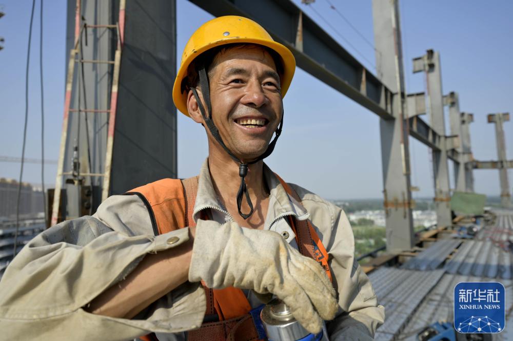 6月16日,在北京市经开区的中建二局安装公司信创园项目,一名安装工在休息间隙喝水,该工地采取错时施工等措施确保生产进度,关爱高温下的劳动者。新华社记者 才扬 摄