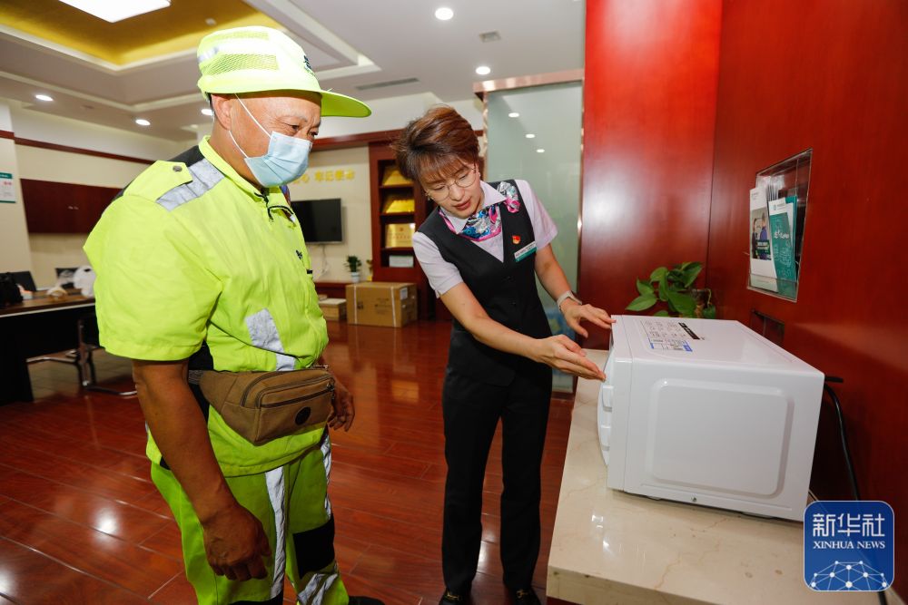 6月16日,在山东济南的中国农业银行泺源支行“浓情暖域·工会户外劳动者服务站点”,工作人员指导环卫工人使用微波炉。新华社发(徐舟 摄)