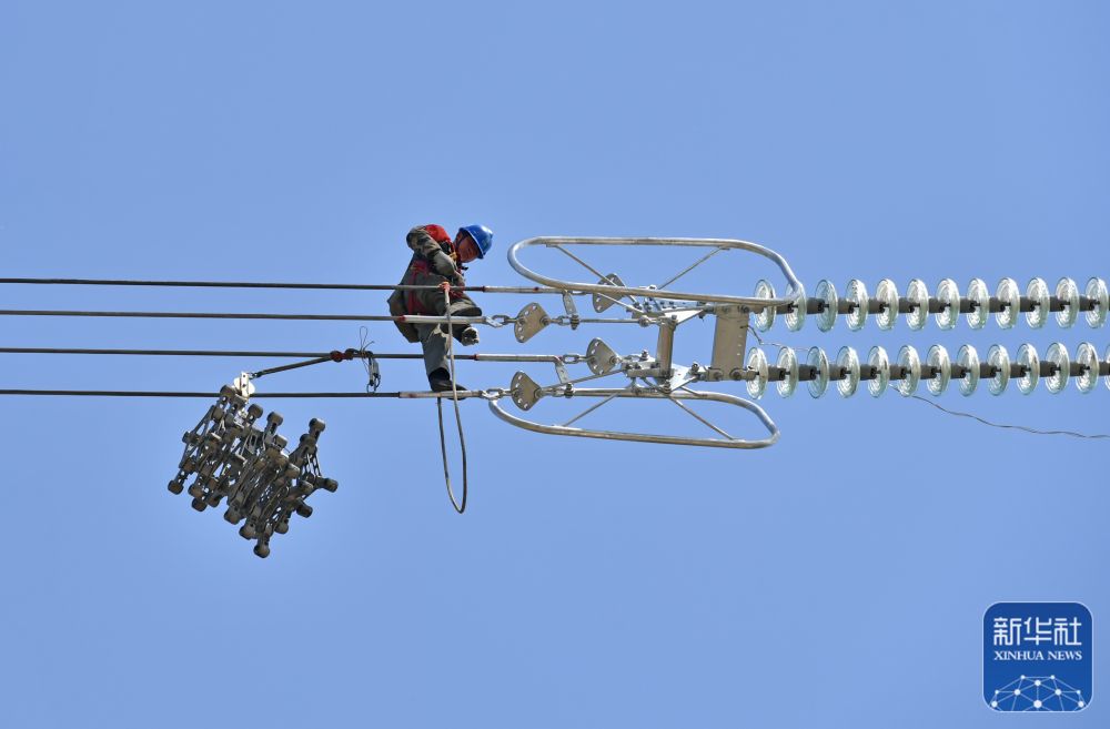 6月15日,在凌绥高速电力线路迁改工程现场,国家电网辽宁朝阳供电公司工程技术人员安装线上间隔棒。新华社记者 杨青 摄