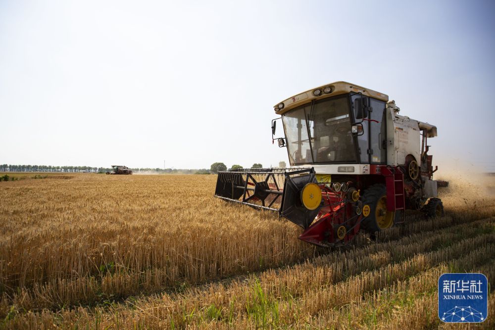6月15日,山东省东营市广饶县乐安街道北朱耿村的农民驾驶收割机收获小麦。新华社发(刘云杰 摄)