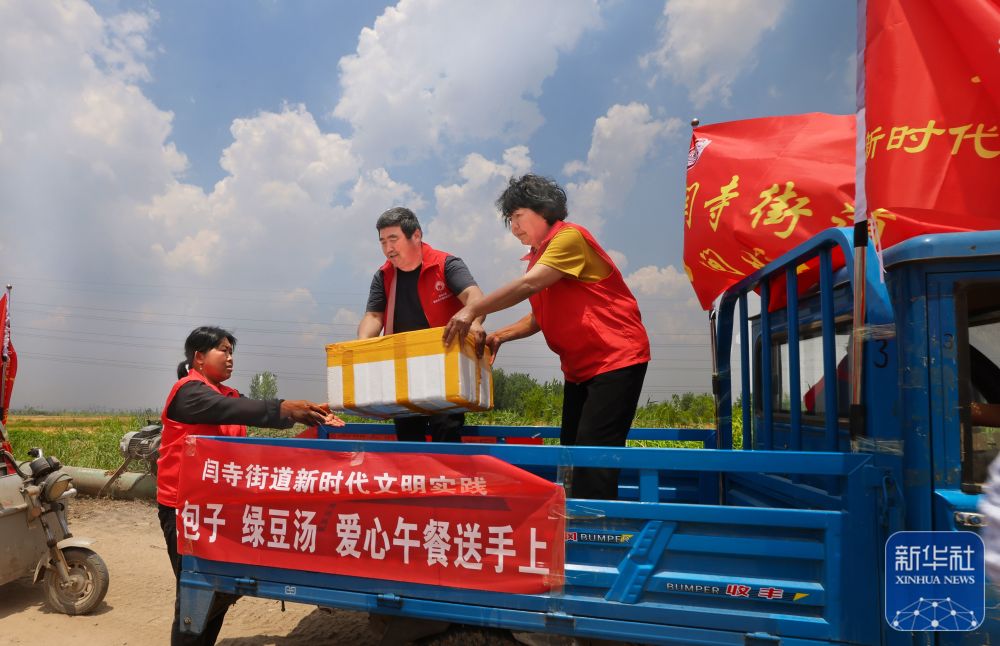 6月16日,山东省聊城市东昌府区闫寺街道办事处的工作人员把爱心午餐送到麦收现场。新华社发(朱玉东摄)
