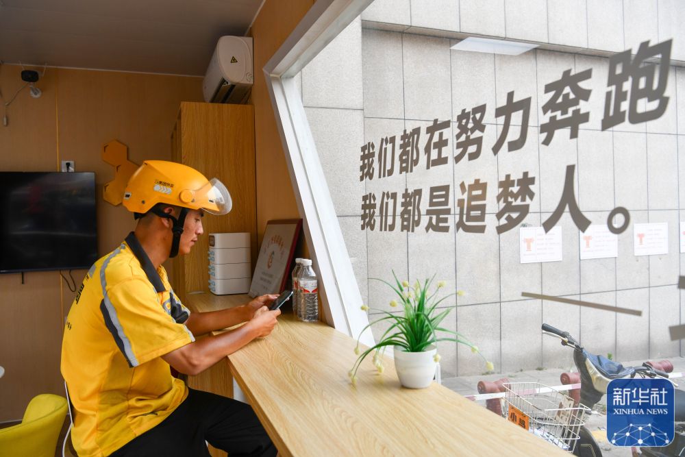 6月16日,在山东邹平市黛溪街道天兴城商圈内的“暖蜂驿站”里,外卖员在送餐空闲期休憩纳凉。新华社发(李晓伟摄)