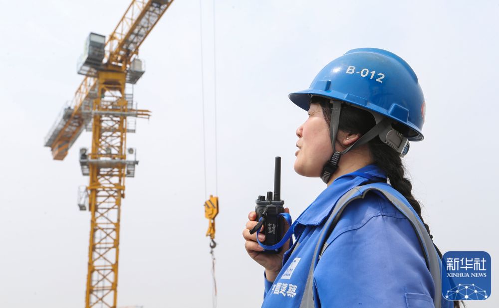 6月16日,在江苏连云港市徐圩新区中化连云港循环经济产业园罐区二期项目施工现场,工人在指挥塔吊运转建筑材料。新华社发(王健民 摄)