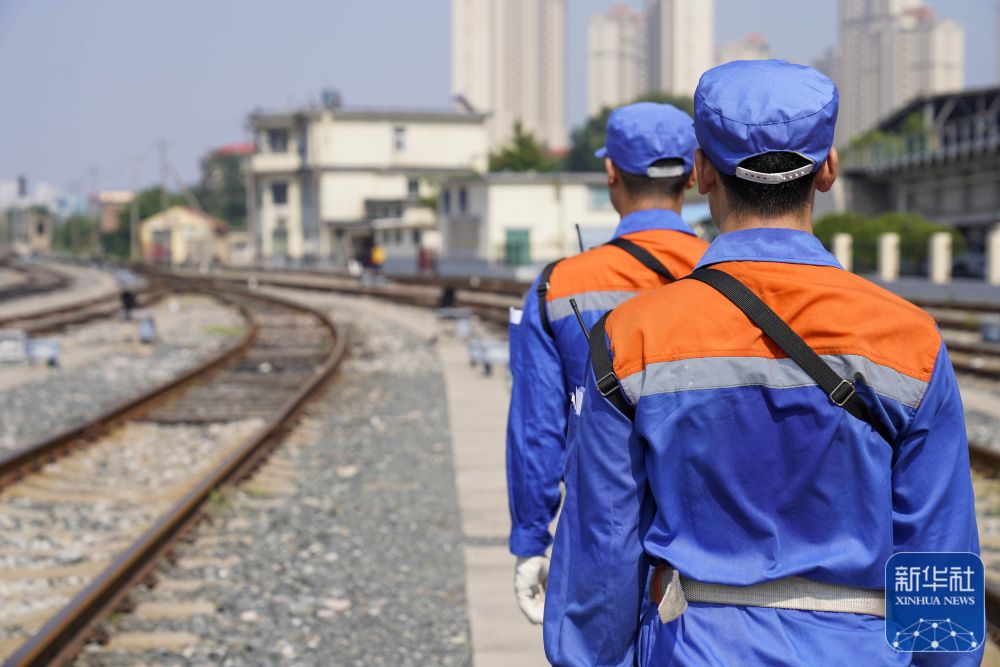 6月16日,中国铁路北京局集团公司有限公司秦皇岛车务段调车组人员在秦皇岛南站作业完毕列队回站。新华社发(郭楠摄)