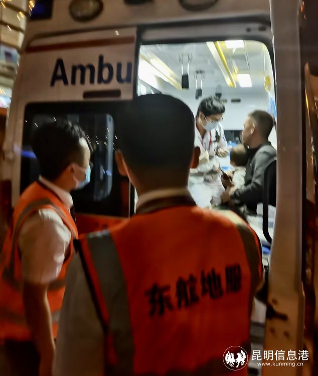 此时东航云南地服人员、机场急救组早已等候在停机位,23时41分,舱门开启,乘务长与地服人员细心交接,为断指幼儿加油鼓劲,送上全体机组成员对其的祝福,23时43分,受伤幼儿同家人乘坐机场急救中心救护车驶离机坪前往医院。