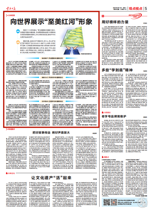 6月19日,云南日报5版刊登文章《向世界展示“至美红河”形象》,聚焦红河哈尼族彝族自治州立足“三千四百年”历史文化名片,借助“云上梯田·梦想红河”品牌,向世界展示“至美红河”。