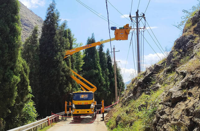 在羊场镇茨营村委会东瓜沟作业现场,带电作业车正在开展作业,工人们相互配合,小心翼翼地进行着绝缘包裹,为接下来的施工做足准备。