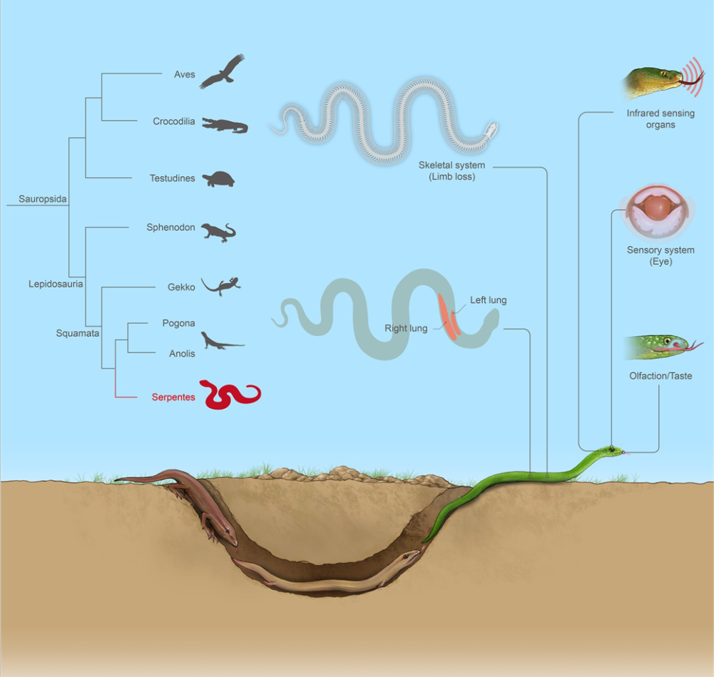 此次,研究人员选取了全球极具代表性的不同支系的蛇类,结合多组学及基因编辑等多学科交叉研究手段,系统阐释了蛇类的起源与特殊表型演化的遗传机制。