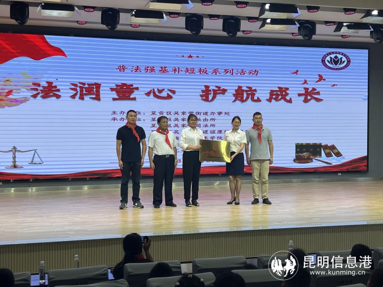 昆明信息港讯 6月20日,谊康社区党总支联合吴家营街道办事处、云南民族大学艺术学院、云南民族大学教育学院青年志愿者协会、吴家营街道司法所、吴家营派出所到昆明理工大学附属呈贡学校开展“法润童心、护航成长”普法宣传活动。会上,吴家营街道党工委委员、办事处副主任田艳辉为昆明理工大学附属呈贡学校授“平安单位”牌匾。