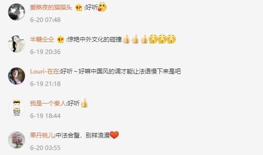 网友纷纷评论,“竟然如此好听!”“人美歌也美”“鲜明的中国传统文化和法国浪漫风情的碰撞真的很有趣”“法国爱黎的演唱让人产生了一种跨越文化的心灵共鸣”,还有网友幽默打趣:“好嘛,中国风的调才能让法语慢下来是吧~”