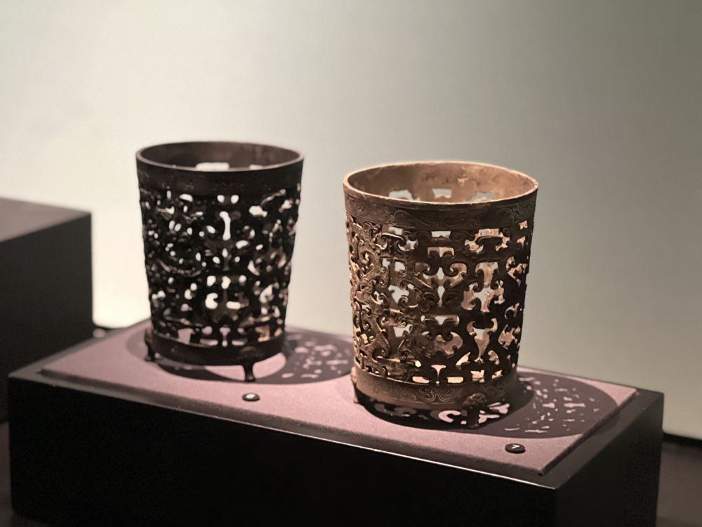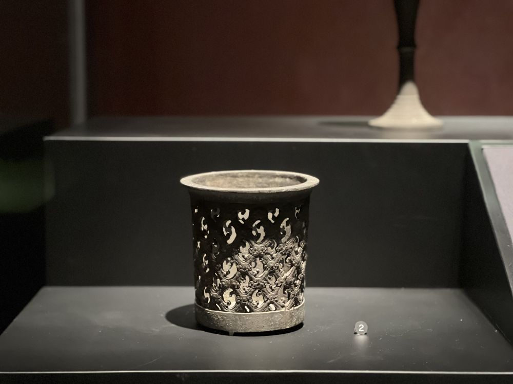 湖北省博物馆展出湖北枣阳九连墩2号墓出土的铜熏杯。新华社记者喻珮 摄