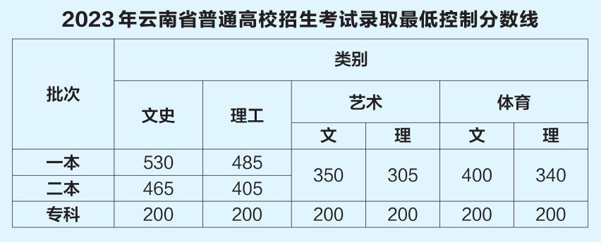 6月23日,经省招生考试委员会审定,2023年云南省普通高校招生考试录取最低控制分数线划定并公布。