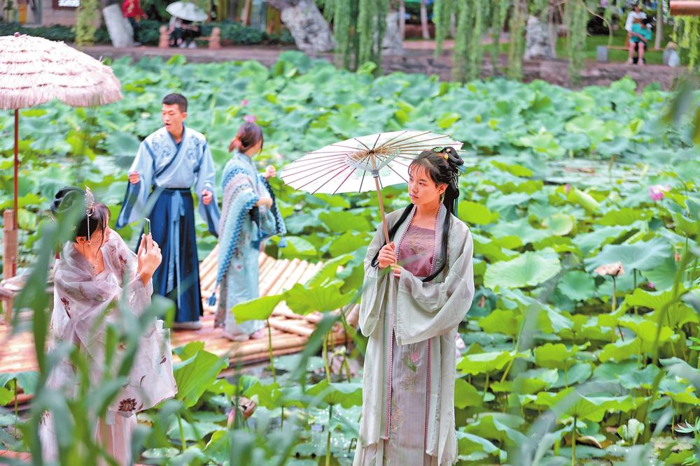 昆明市翠湖公园的40余亩荷花悄然开放,吸引众多市民和游客利用端午假日前来观赏,在清芬满溢的荷塘边尽享悠闲。汉服爱好者衣袂飘飘,与夏荷莲叶构成一幅幅充满韵味的国风画卷。(云南日报 记者陈飞)