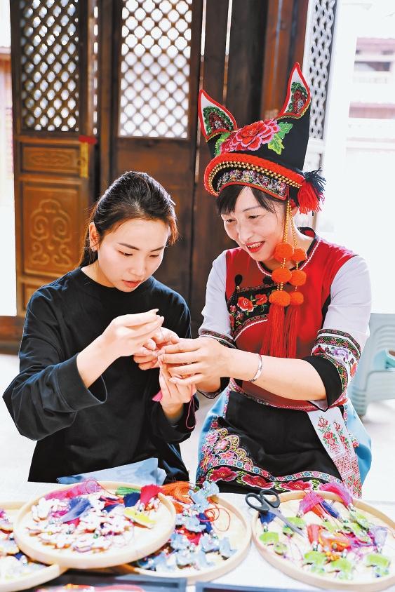 走进白族布扎省级代表性传承人杨银梅位于大理白族自治州剑川古城的“银梅布扎”工作室,精巧的手工布扎工艺品让人目不暇接,淡淡的药草香令人精神一爽。“白族布扎不仅是我们的一项非遗技艺,也是我们剑川妇女爱心的一种表达方式。在端午节,母亲都要为孩子佩戴一串布扎祈求安康。”杨银梅说。栩栩如生的图案、色彩鲜艳的布料、精美的刺绣,艾叶、樟脑等药草的清香,驱邪镇恶、迎吉纳福的美好寓意,使得白族布扎深受人们喜爱。(云南日报 记者胡妤雅)