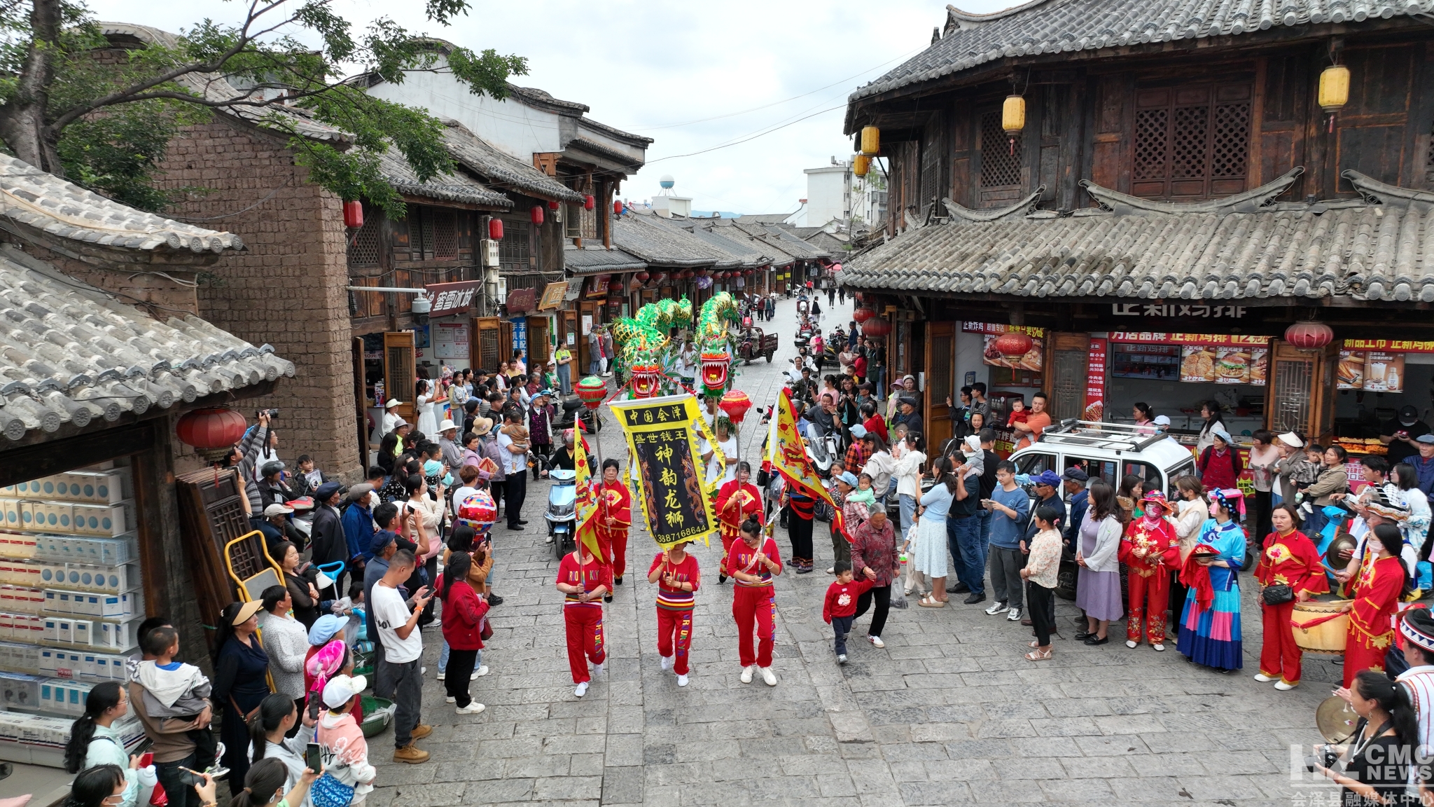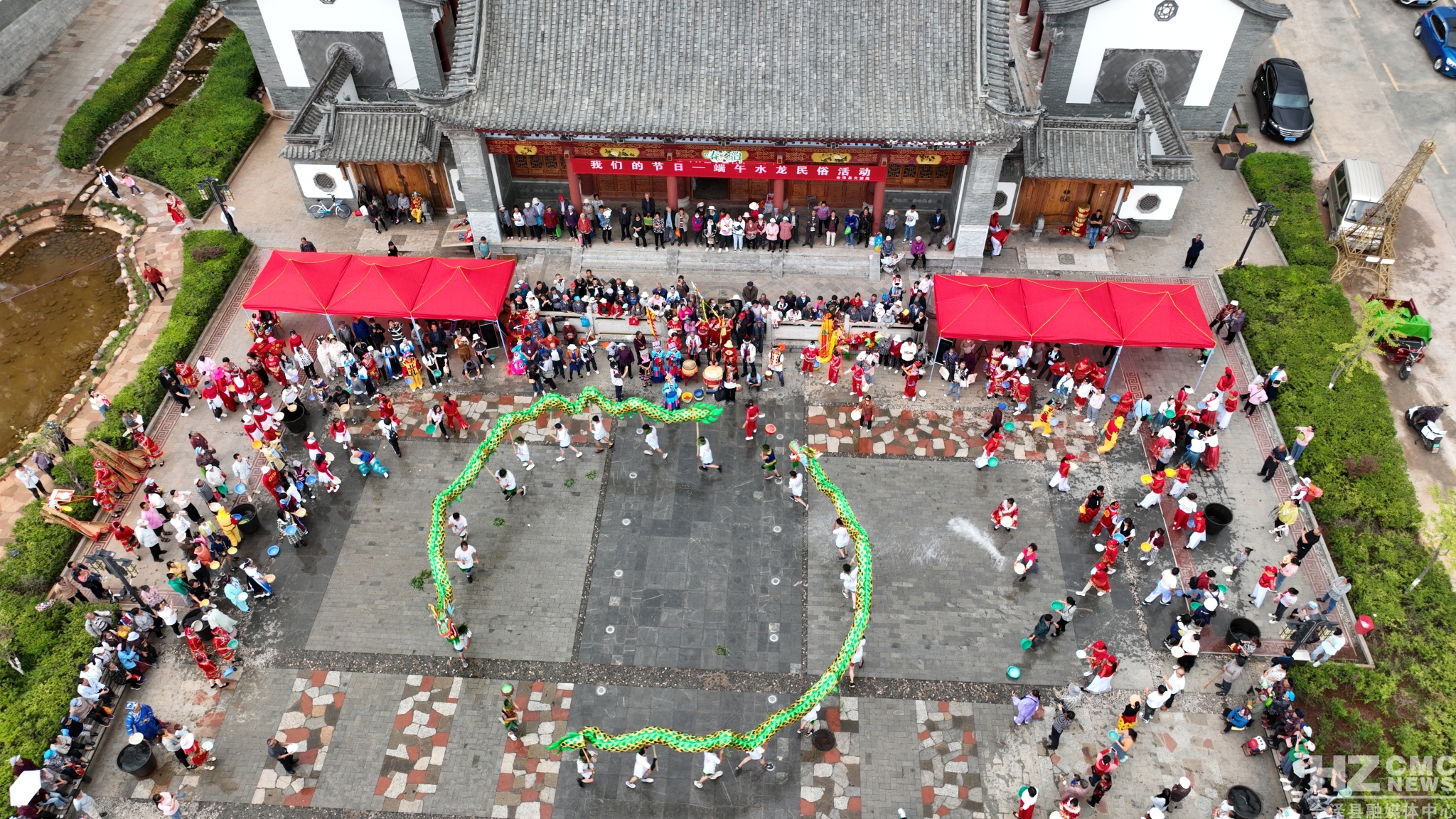 当天中午1点16分,表演队伍身着各式鲜艳的服饰,伴随着锣鼓声,沿着街道开始巡游。所到之处,人们蜂拥跟随。下午2时,由二十个头戴柳帽的壮汉高举的两条“水龙”,在大家的簇拥下,来到会泽古城的博物馆广场,结束巡游,开始“耍水龙”表演活动。