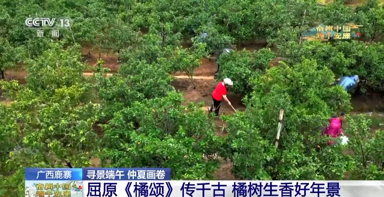 广西柳州市鹿寨县的万亩砂糖橘种植基地,在这端午时节,眼前的这片橘树让我们想起屈原《九章·橘颂》中的那句“后皇嘉树,橘徕服兮”。屈原爱橘,发出由衷的赞美——橘啊,你这天地间的嘉美之树,生下来就适应这方水土。