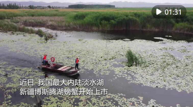 近日,我国最大内陆淡水湖新疆博斯腾湖螃蟹开始上市,绿意盎然的湖上水美蟹肥、渔船穿梭,一派忙碌景象。