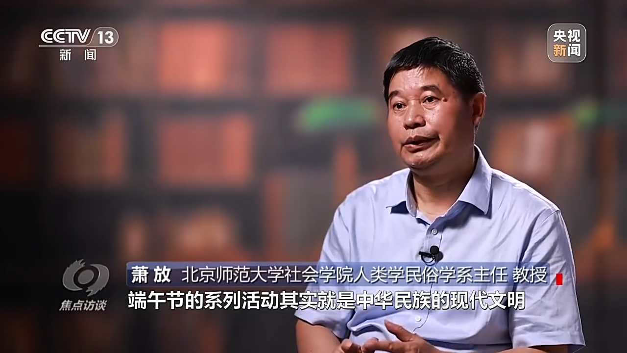 北京师范大学社会学院人类学民俗学系主任、教授 萧放:习近平总书记在文化传承发展座谈会上特别讲到中华民族现代文明,端午节系列活动其实就是中华民族的现代文明。它既有几千年的深厚的民族文化底蕴,今天我们依然通过这个活动来表现中国人的文明观,跟自然协调,对家庭、社会团结的重视,伦理的强调,还有家国情感的传承。
