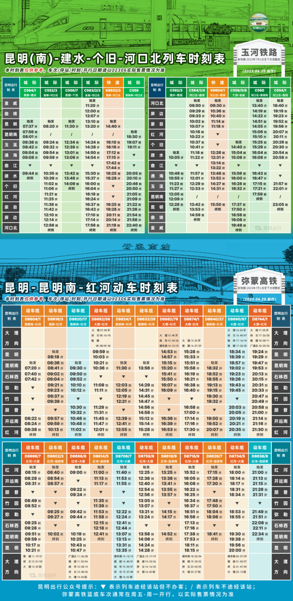 弥蒙高铁多趟动车时刻、停站有调整。其中: