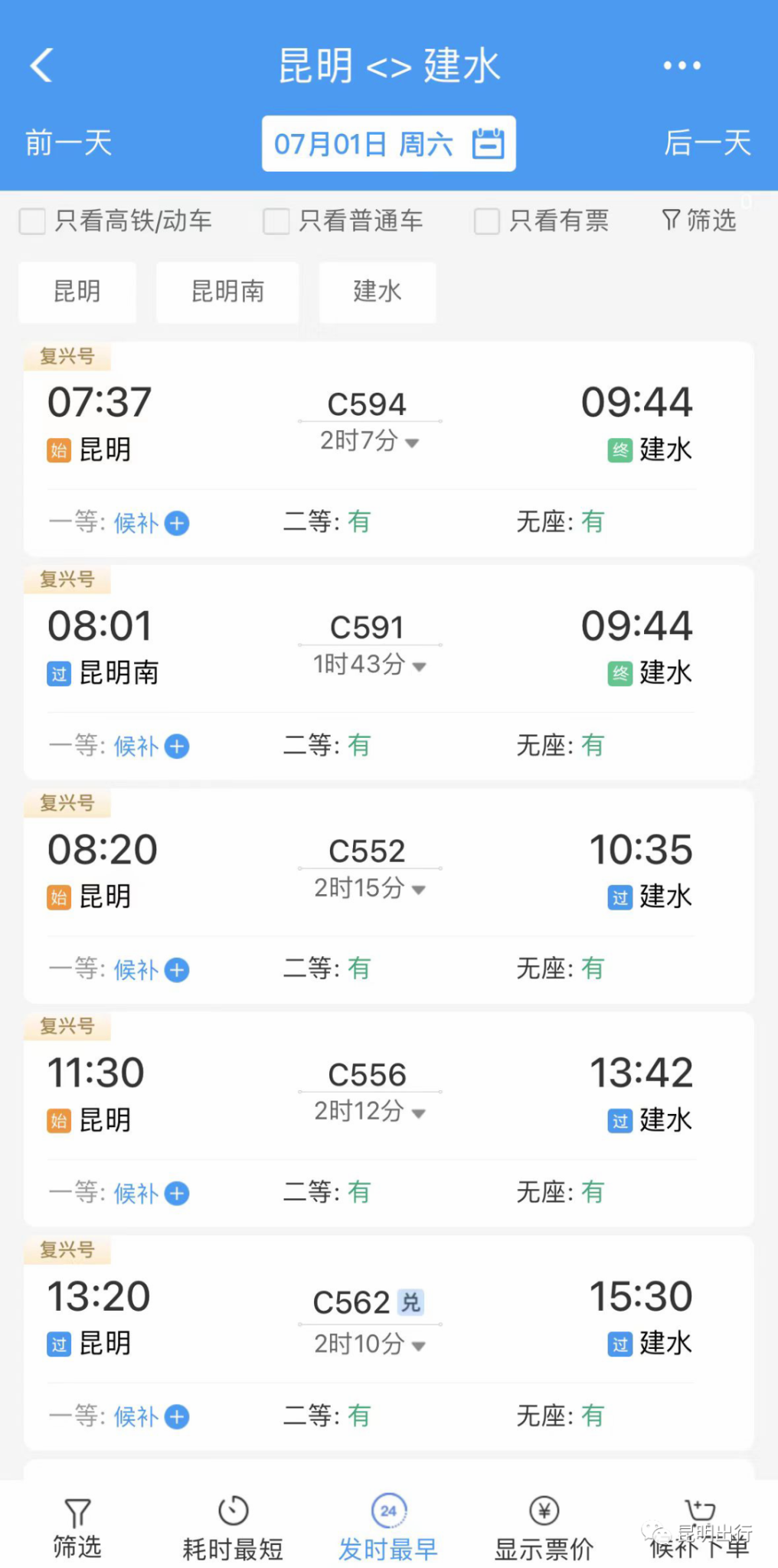 ●昆明站至建水站C594/1次昆明站开车时间由07:50提早到07:37。建水站开往昆明站C592/3次建水站开车时间由10:30提早到10:05。
