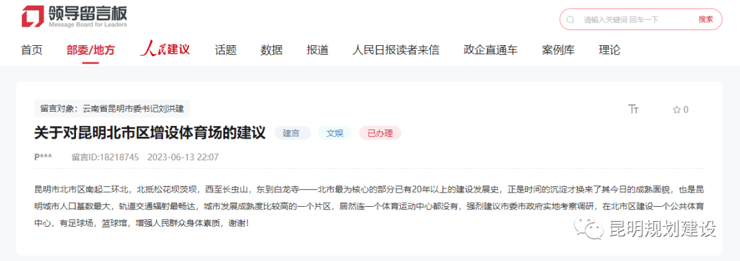 该网友表示:“昆明北市区最核心的部分已开发建设20余年,作为昆明城市人口基数最大、轨道交通辐射最畅达的片区,北市区范围内缺少体育运动中心,不方便市民进行社会体育运动。”