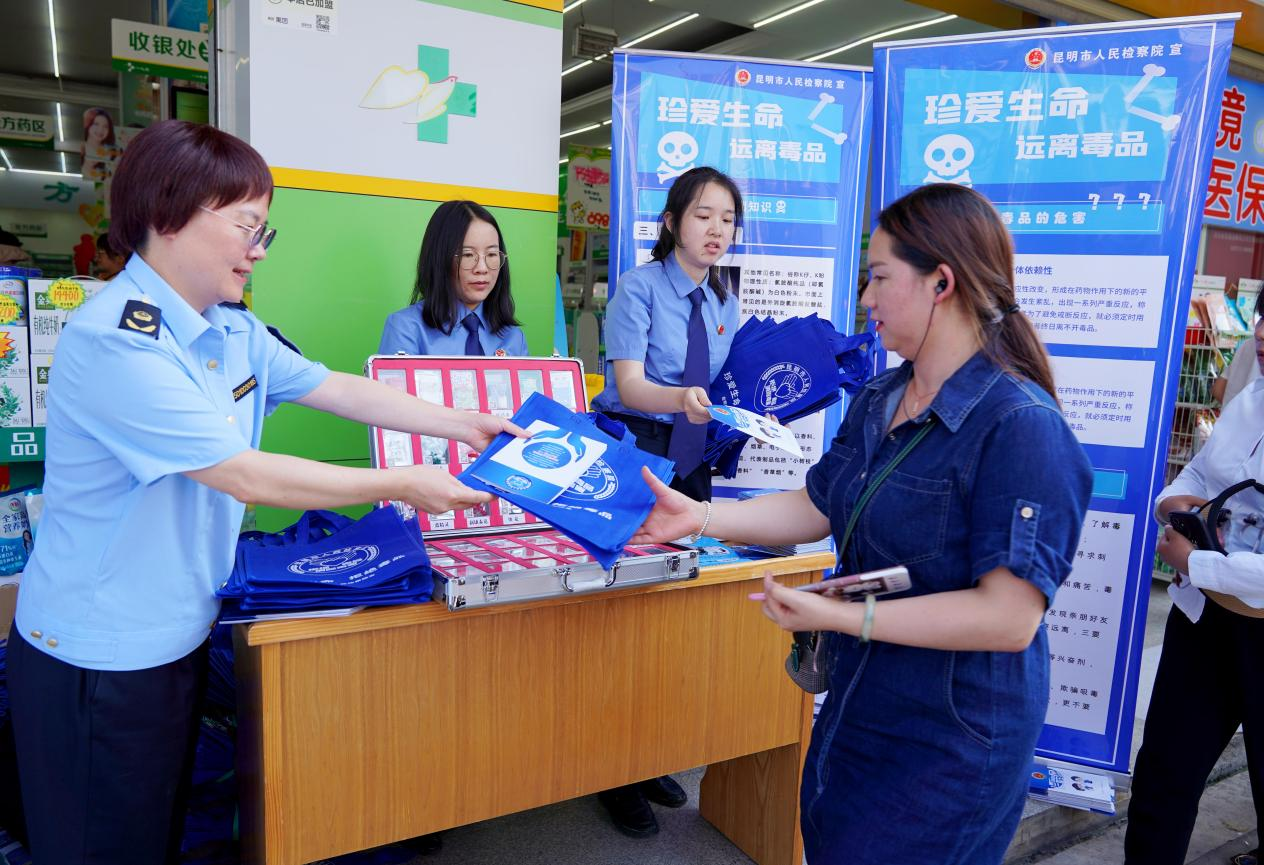 会后,昆明市市场监督管理局和昆明市人民检察院工作人员在一心堂昆明西部药城一店门口向市民发放宣传册,科普合理用药拒绝滥用等知识,呼吁民众远离毒品,珍爱生命。