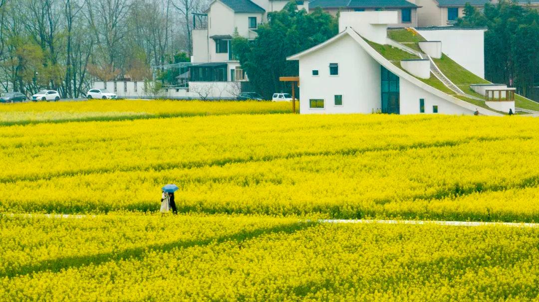 △2023年3月16日,浙江省杭州市桐庐县梅蓉村千亩油菜花竞相绽放,吸引游人休闲赏花。