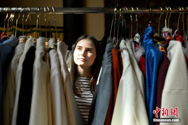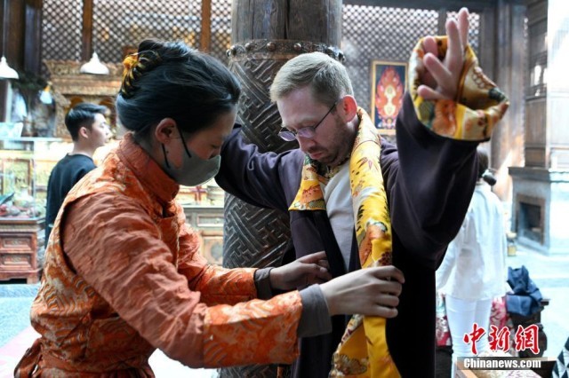 图为工作人员帮助“Z世代”青年试穿藏族服饰。李嘉娴 摄