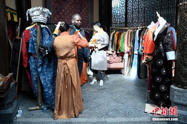 “Z世代”青年试穿藏族服饰。李嘉娴 摄