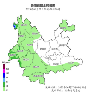 27日20时—28日20时:怒江州北部阴有中到大雨局部暴雨,迪庆州、怒江州南部、丽江市、大理州、保山市、德宏州、临沧市、普洱市、西双版纳州、红河州南部、文山州南部、昭通市北部多云有阵雨局部大雨,其他地区多云间晴。怒江州贡山县,保山市龙陵县,德宏州盈江县、陇川县,红河州绿春县发生滑坡泥石流的风险高;怒江州北部、南部,大理州中部、北部,保山市北部、南部至东南部,德宏州大部,临沧市西北部、南部,普洱市中部、东部,红河州南部,文山州西南部发生滑坡泥石流的风险较高。