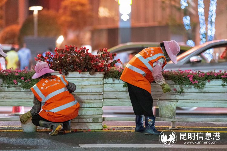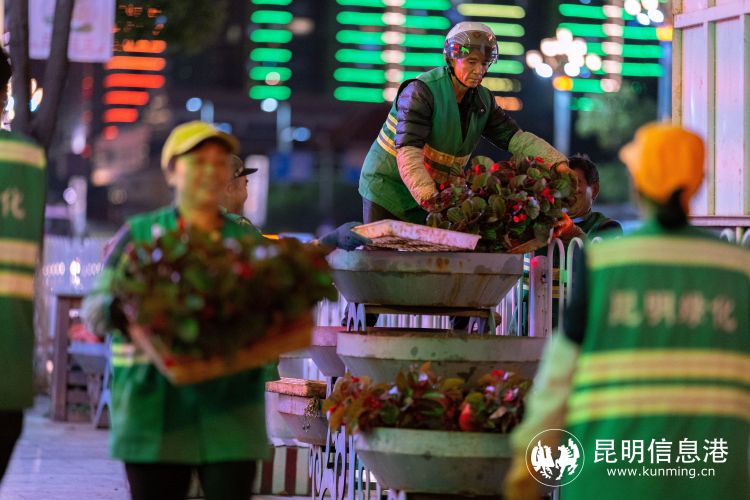 此外,为了避免正午高温时土壤突然受到冷水刺激,影响作物生长,园林工人们还需要在白天的工作结束后,夜间加班进行浇水。灯火通明的夜晚,人流稀少的街道,喷洒的水雾与工人的汗珠在城市夜间的霓虹中闪烁,当车水马龙归于宁静,只有夜里吹过的凉风和湿润的泥土气息伴着这群忙碌的园林人一同前行。正是这群城市里的园林工人们任劳任怨、夜以继日地坚守,才使得昆明这座城市依然绿色盎然。