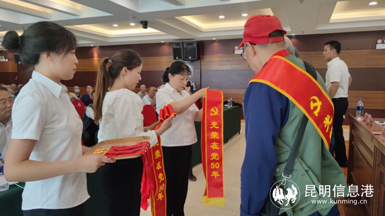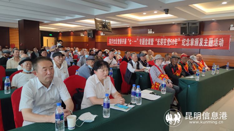 昆明信息港讯 记者甘凌菲 通讯员罗敬刚 为庆祝中国共产党成立102周年,切实落实党内关怀,开展党性教育,增强党员的归属感、使命感,凝聚党内磅礴力量。6月29日,昆明经开区阿拉街道航天社区开展了“七一”专题党课暨“光荣在党50年”纪念章颁发主题活动,共200余名党员参与。