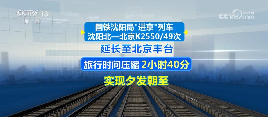 此次调图,国铁沈阳局“进京”列车沈阳北—北京K2550/49次延长至北京丰台,旅行时间压缩2小时40分,实现夕发朝至。