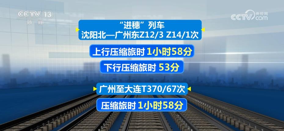 “进穗”列车沈阳北—广州东Z12/3、Z14/1次上行压缩旅时1小时58分,下行压缩旅时53分,广州—大连T370/67次压缩旅时1小时58分。