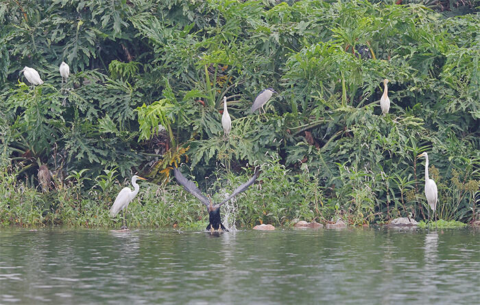 黑腹蛇鹈来到弄莫湖后,基本上每天三个时段准时出场,早上9点、中午12点、傍晚7点,它会从茂盛的大树里钻出来,不紧不慢地站到树枝上梳理羽毛,然后扑腾到湖里逮鱼。每天的食量不算很大,早中晚三次每次吃2到3条鲜鱼,然后就在湖面上飞一圈,和左邻右舍的白鹭、夜鹭、黑颈鸬鹚一起互动。