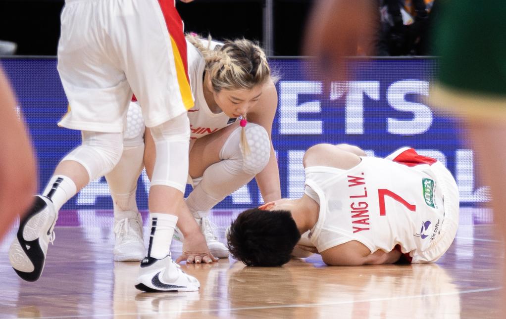 7月1日,中国队球员杨力维(右)在比赛中被撞倒。新华社发(胡泾辰摄)