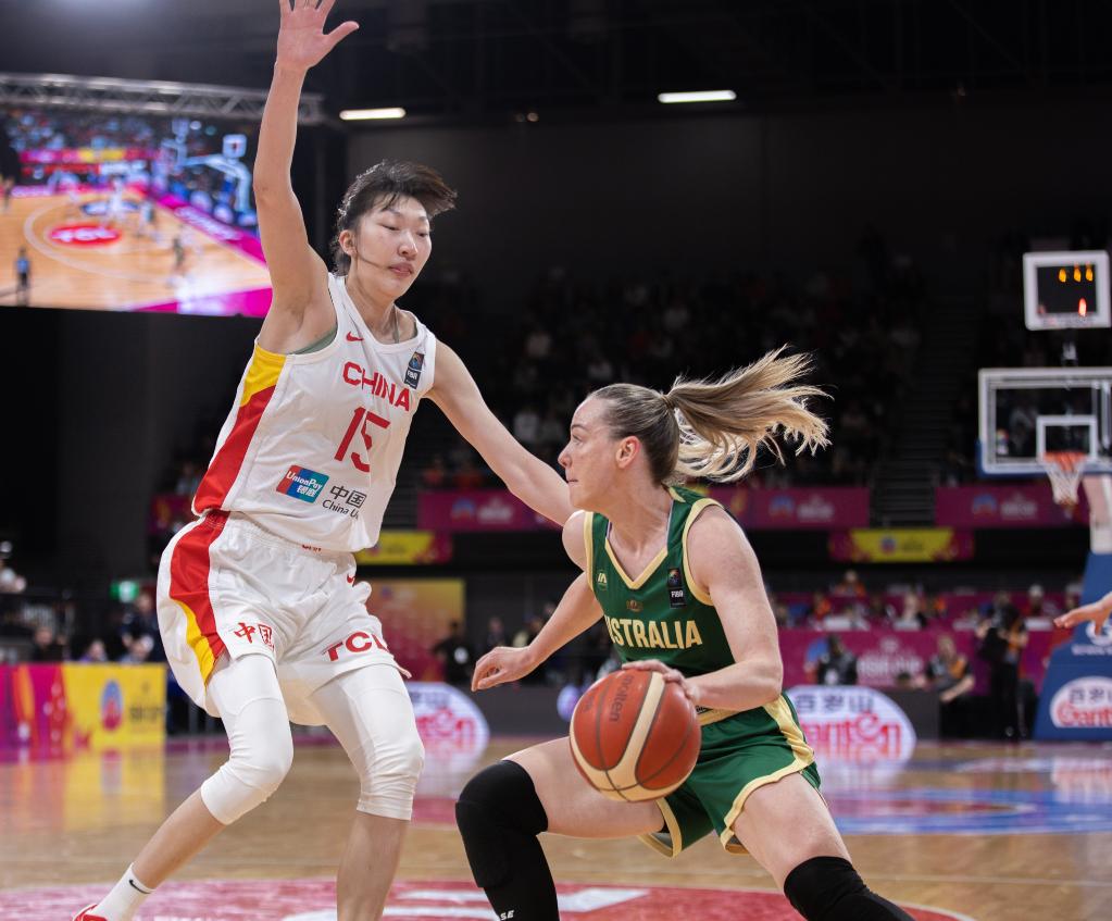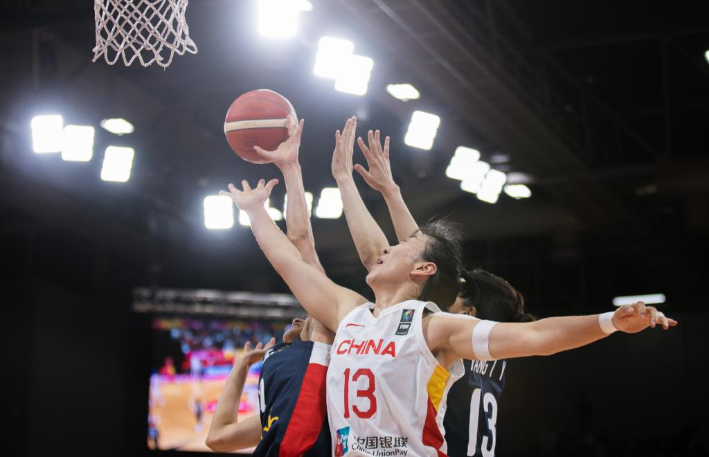 6月28日,中国队球员高颂(前)在比赛中拼抢篮板球。新华社发(胡泾辰摄)