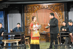 在莲花池庭院剧场演出开始前,演员与观众进行互动。