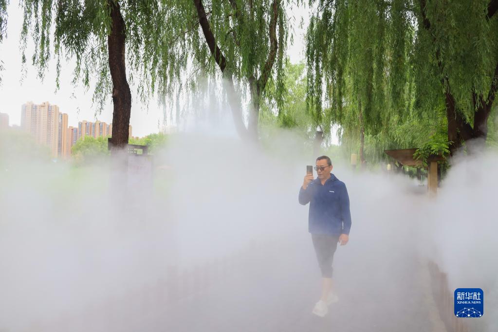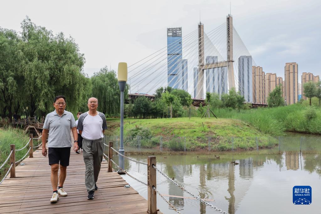 7月3日,在甘肃省兰州市安宁区,市民在银滩湿地公园散步。新华社记者马希平/摄