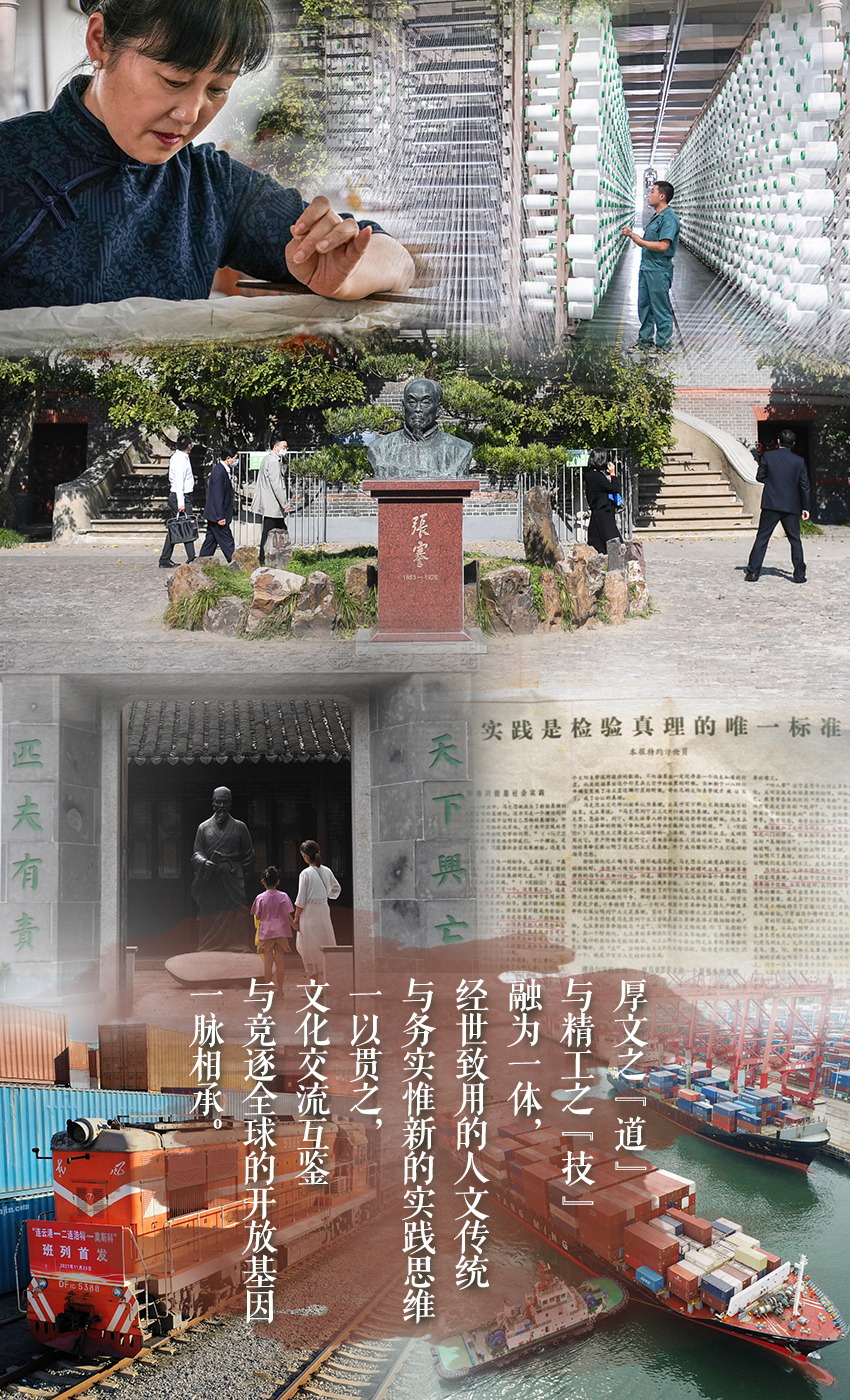 ——经世致用的人文传统与务实惟新的实践思维一以贯之。17世纪后半期,以昆山人顾炎武为首的实学派反对明末空谈心性的空疏学风,提出经世致用的见解主张、身体力行的实践态度,领风气之先。这一朴素的唯物论思想对后世影响深远:民族危难之际,南通人张謇选择实业救国路线,作为民族企业家的先贤和楷模至今影响当代企业家实干创新,实业报国;改革开放年代,无锡人胡福明作为主要作者撰写的《实践是检验真理的唯一标准》发表,在全国掀起关于真理标准的大讨论,江苏坚持先行先试、在实践中创新;进入新时代,江苏更加注重锻造实体经济看家本领,重视科技创新创造,已拥有联合国产业分类全部41个工业门类中的40个,制造业增加值占全国13.7%、全球近4%……