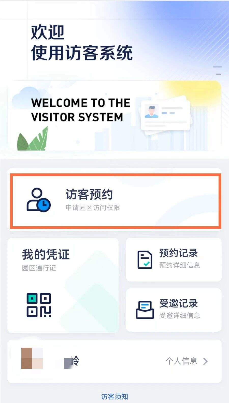 ④进入“访客首页”,点击“访客预约”;