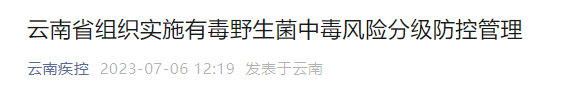 7月6日,“云南疾控”微信公众号发布《云南省组织实施有毒野生菌中毒风险分级防控管理》,全省共划定有毒野生菌中毒风险,高风险地区7个,中风险地区51个,低风险地区62个。