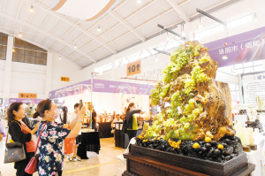 在9号馆,一块块大小不一的“五花肉”引人关注。展位负责人徐先生介绍,猪肉石打造的五花肉摆件很受欢迎。“五花肉摆件象征着富贵,小的一块200多元,大的一块300多元,今天展会开幕不久就卖了3块。”在该展位附近,一棵用古青玉打造的多子多福树很抢眼,褐色的树干上挂满了“葡萄、果篮、葫芦”等。据介绍,该景观由一整块古青玉雕刻而成,用时1年半,价格180万元。